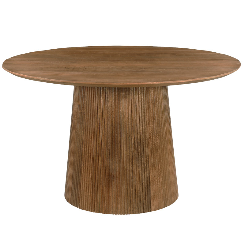 La mesa de comedor redonda para 4 personas que se presenta tiene un diámetro de 130 cm y un acabado natural.
