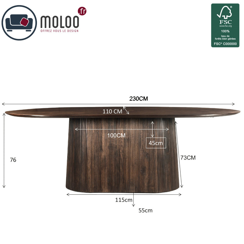 La mesa ovalada que se muestra mide 230 x 110 cm y está teñida de marrón.