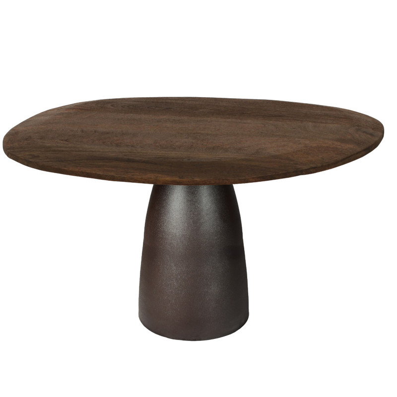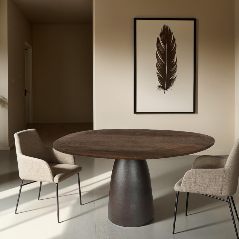 Mesa de comedor presentada con tablero teñido en marrón, diámetro 140 cm y pata metálica Expresso.
