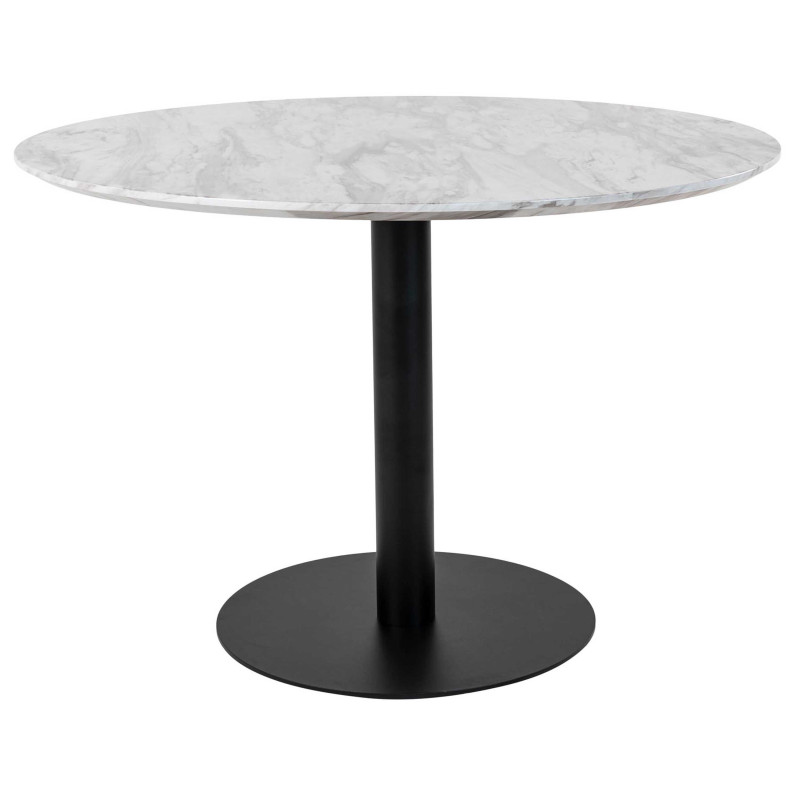Un contraste contemporáneo. Esta mesa redonda combina la sofisticación del efecto mármol con el minimalismo de una base de metal negro. La fusión perfecta de materiales y líneas para un espacio moderno y refinado.