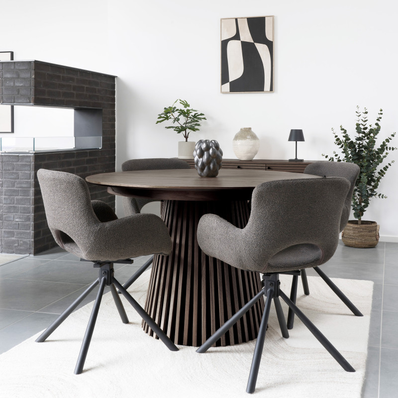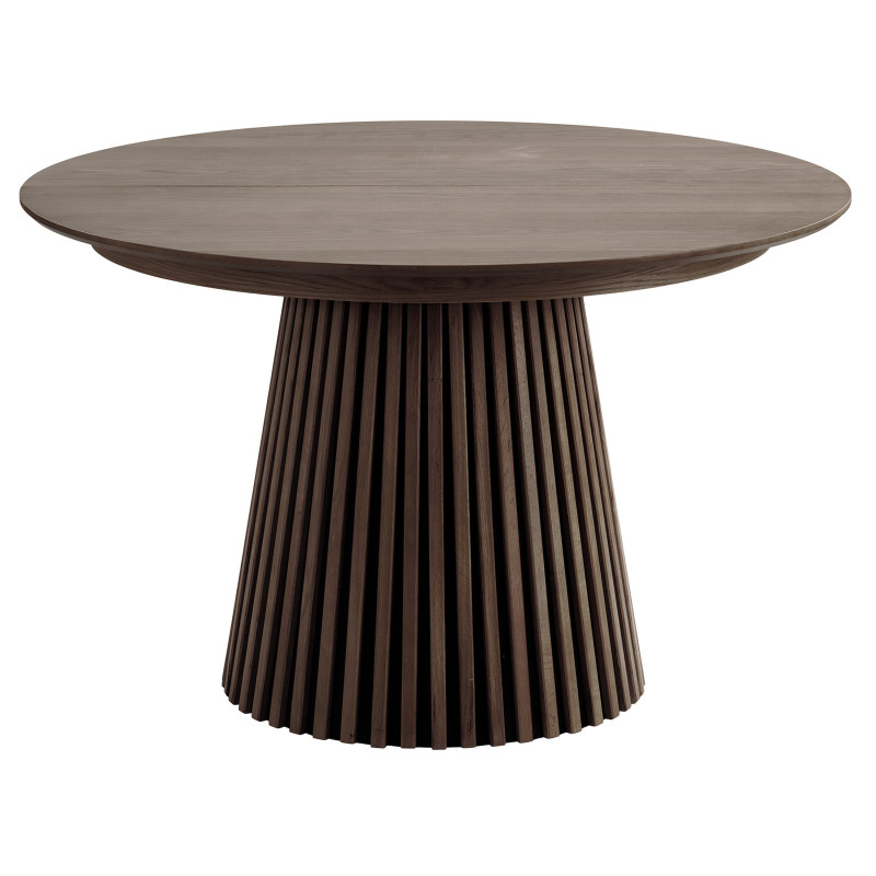 Diseño escultural y acogedor. Esta mesa redonda de roble ahumado destaca por su sólida base. Se extiende para acomodar de 8 a 10 personas con sus 2 extensiones incluidas. El acabado en roble ahumado le confiere un estilo contemporáneo.