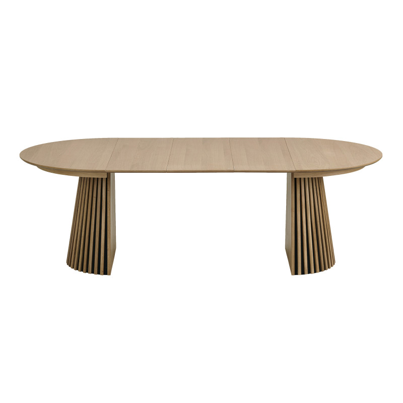 Gran capacidad. Esta mesa de roble natural se extiende para acoger hasta 12 personas gracias a sus 3 extensiones incluidas. Su diseño, centrado en la base de roble, es un detalle encantador. La combinación perfecta de material y líneas para un espacio amplio y acogedor.