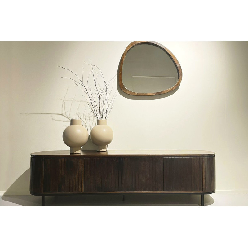 Los muebles de la colección MENTON están elaborados con refinada madera de mango y están disponibles en acabados nogal y natural. Su forma elíptica y sus laterales curvos, combinados con un juego de líneas verticales, son característicos de esta colección: ¡un guiño al estilo retro chic!