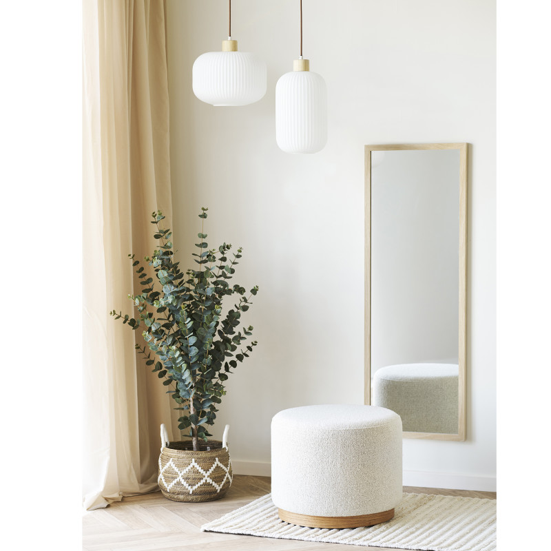 Textura y curvas. Este puf redondo en tela color arena ofrece un asiento extra o un elegante reposapiés. Su base de madera le aporta calidez. La combinación perfecta de material y diseño para un rincón acogedor.