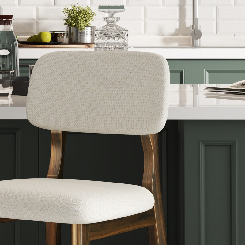 La silla de bar CLIFF de tejido Trendy tiene una altura de asiento de 65 cm, ideal para una isla central de cocina.