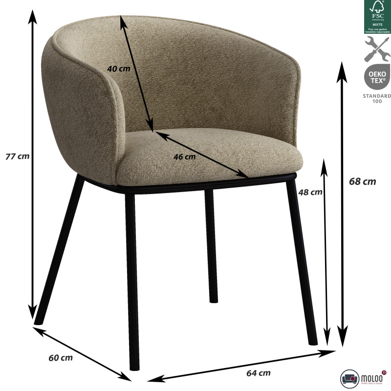 Nos gusta la curva asertiva de su asiento monobloque acolchado con 7 cm de espuma de alta resiliencia (26 kg/m3) que invita a largas comidas entre amigos. , cómodamente sentado.