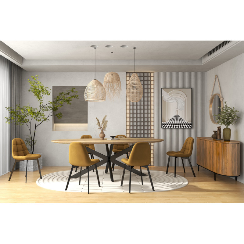 De inspiración escandinava revisitada con un espíritu chic y contemporáneo, la silla STELLIA combina un cómodo asiento cosido con una pata de metal negro muy moderna. Está disponible en varios colores variados, en un bonito terciopelo de fácil cuidado. br />Versión presentada en juego de 4 y terciopelo Mostaza.
