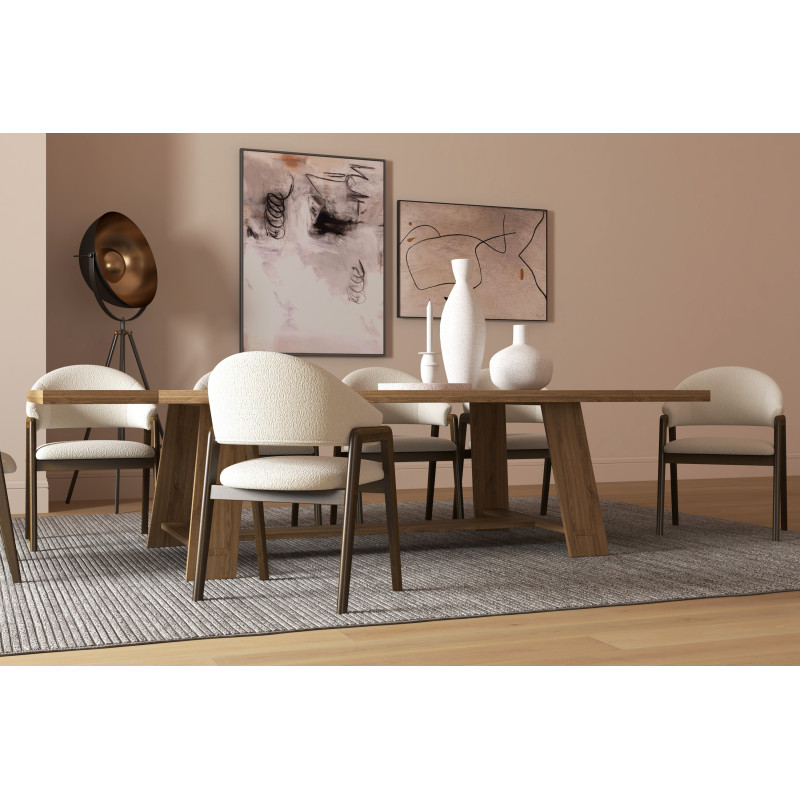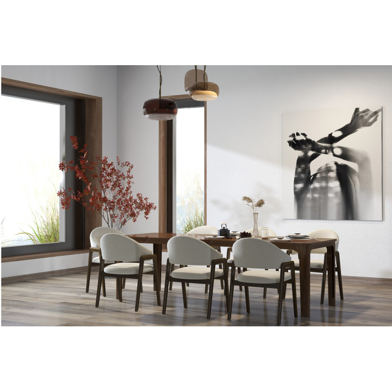 Versión presentada en fresno teñido nogal y tela Curly Ecru.