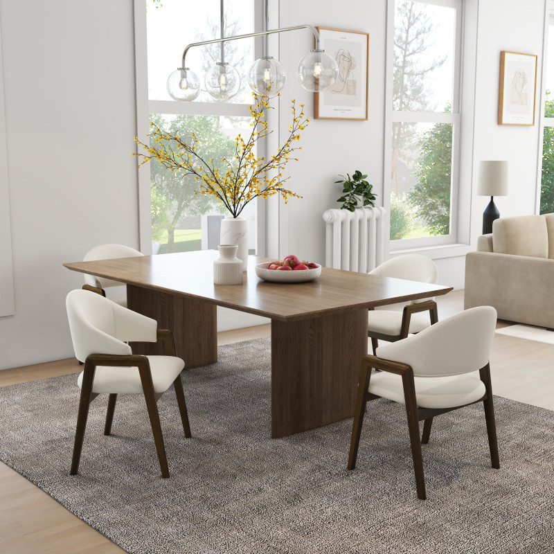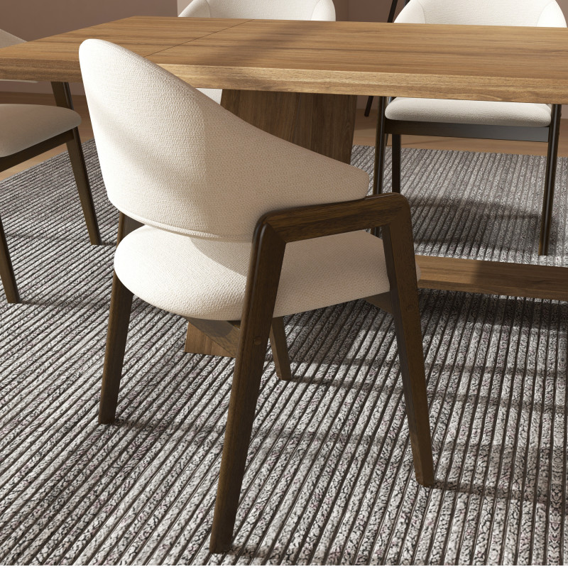 Versión presentada en fresno teñido nogal y tela Trendy Ecru.