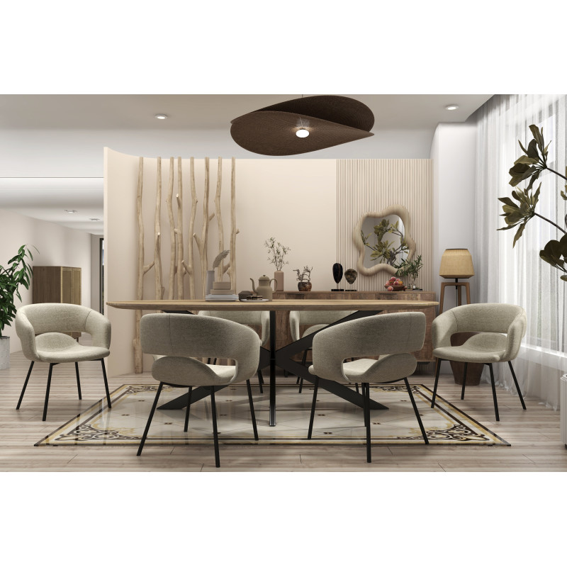 Versión presentada en tejido premium Luxury Beige, certificado OekoTex y pie de metal con decoración de roble.