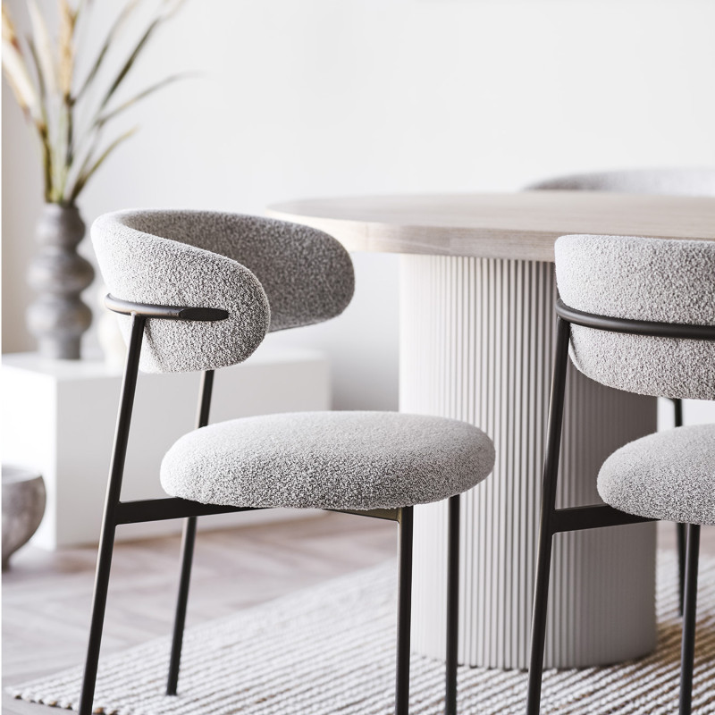 Suavidad escandinava. Este sillón en tela bouclé color arena ofrece un asiento cómodo y elegante. Las patas de metal negro crean un contraste perfecto. La combinación ideal de material y diseño para crear un espacio acogedor.