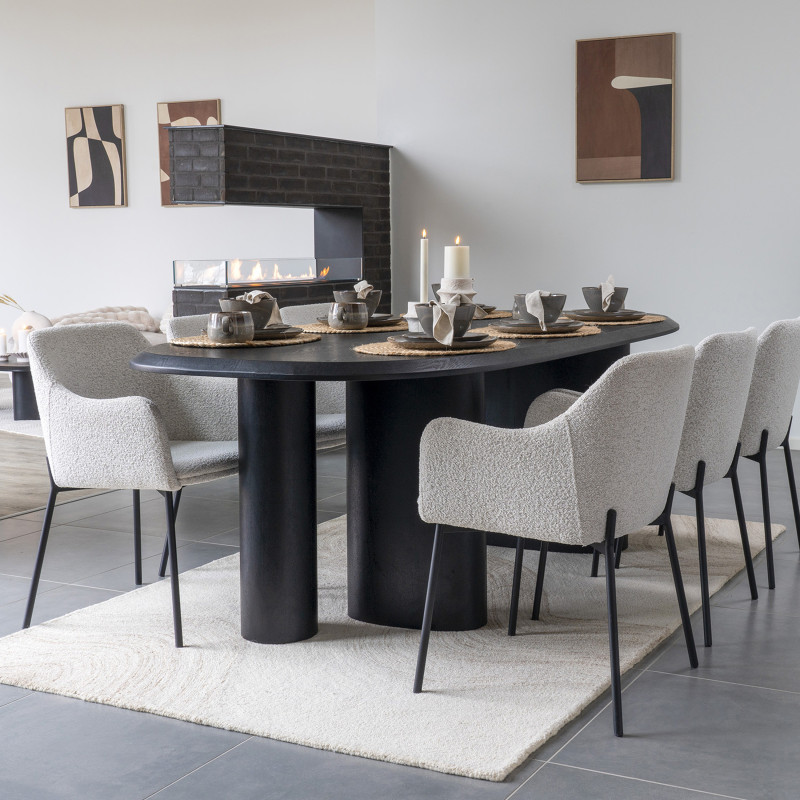 Textura elegante. Esta silla de comedor bouclé color crudo combina la comodidad de un sillón con la funcionalidad de una silla. La base de metal negro le da un toque moderno. La combinación perfecta de material y diseño para disfrutar de comidas confortables.