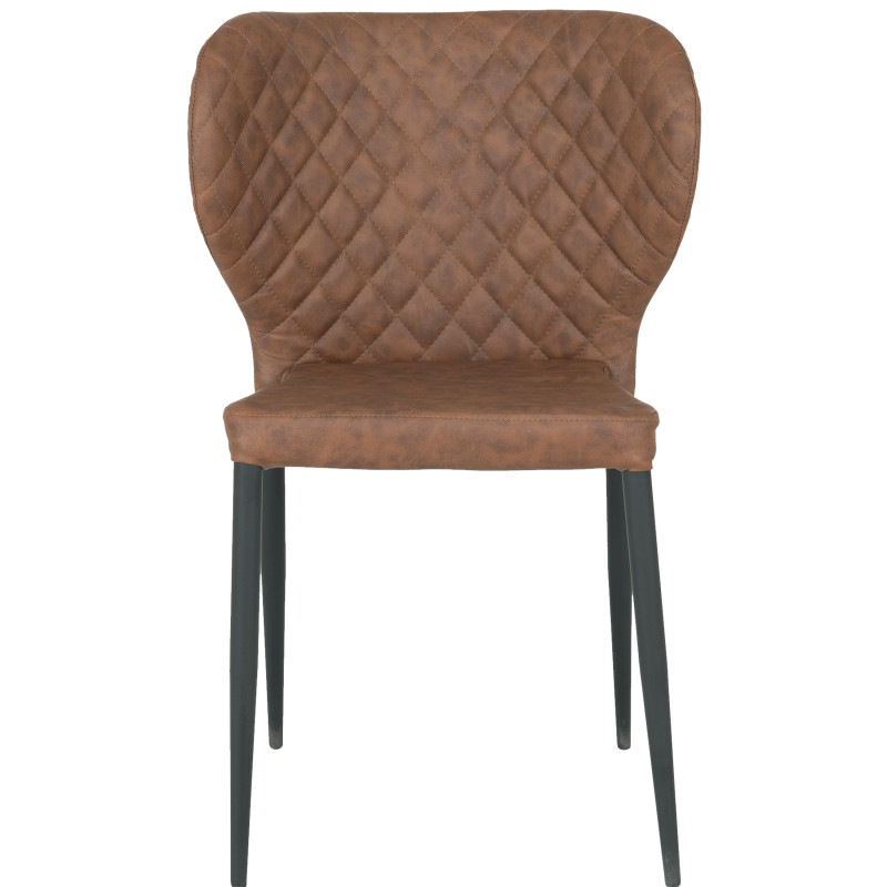 Calidez y elegancia discreta. Esta silla marrón de piel sintética aporta calidez a tu mesa. La base de metal negro crea un sutil contraste. La combinación perfecta de material y diseño para una experiencia gastronómica elegante.
