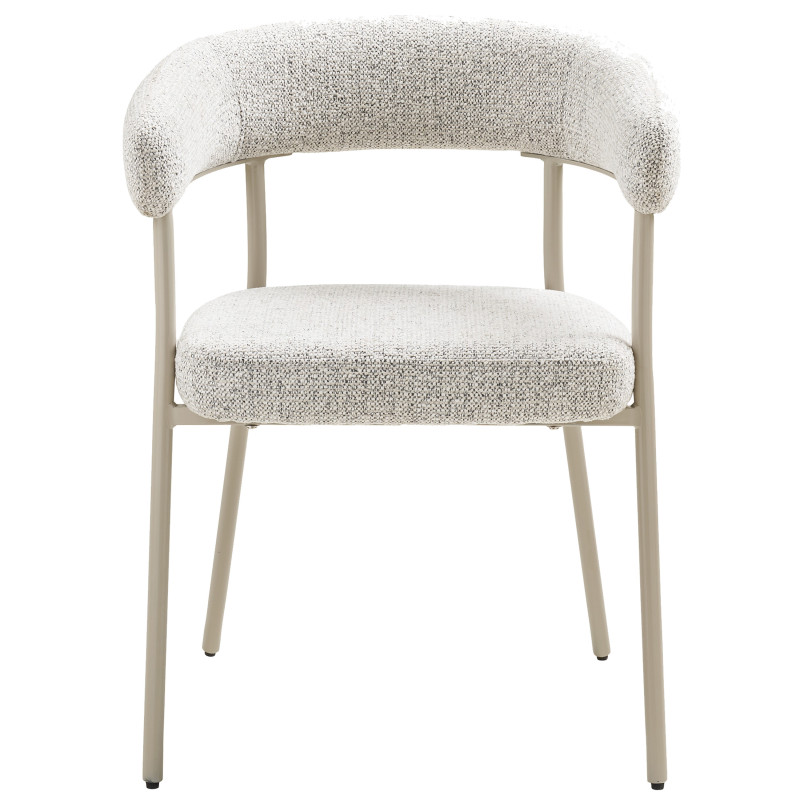 Suavidad y luminosidad. Esta silla de comedor tapizada en tela color arena es ideal para dar luminosidad a cualquier estancia. Su base metálica color beige crea una armonía sutil. La combinación perfecta de materiales y líneas para un interior fresco y luminoso.