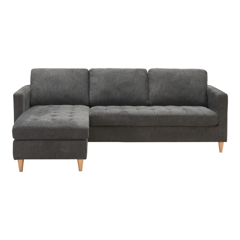 Modular y elegante. Este sofá esquinero de tela gris oscuro es reversible, adaptándose a cualquier distribución del salón. Su diseño minimalista y su excepcional comodidad lo convierten en una pieza moderna imprescindible.