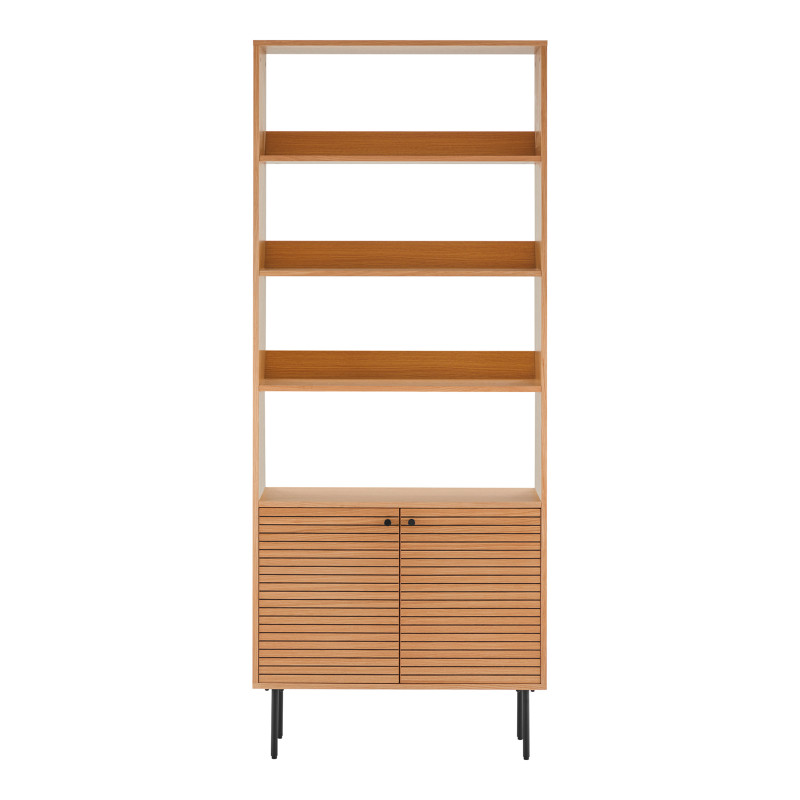 Collection LOGIA : Bibliothèque Chêne Naturel Verticalité et naturel. Cette bibliothèque haute chêne naturel et métal offre deux portes pour un rangement fermé. Son design élancé est idéal pour optimiser l'espace. L'alliance parfaite de la matière et de la ligne pour un intérieur structuré. Dimensions : L. 80 x l. 30 x H. 200 cm