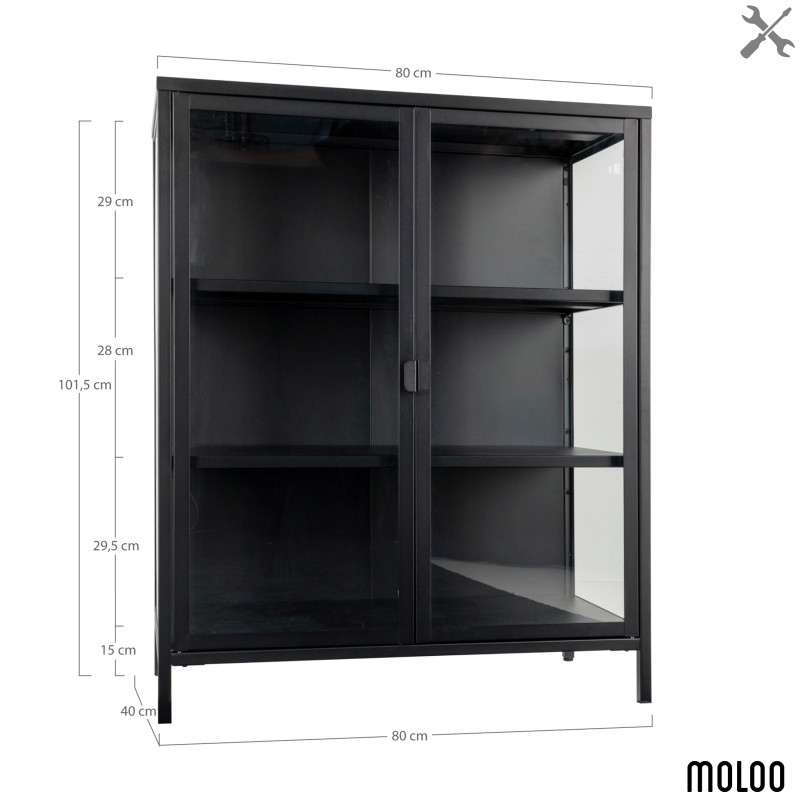 Collection MAINE : Vitrine Noire 2 Portes Vitrine en noire en acier et verre idéale pour structurer l'espace. Le design industriel chic est mis en valeur par sa hauteur. L'alliance parfaite de la matière et de la ligne pour un meuble d'exception. Dimensions : L. 80 x l. 40 x H. 101 cm