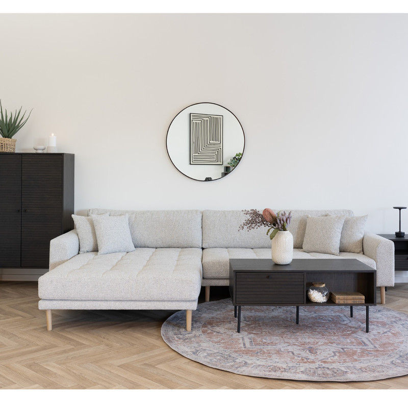 Luminosité scandinave. Ce canapé d'angle en tissu beige avec méridienne à droite est idéal pour les intérieurs clairs et épurés. La méridienne est un appel à la détente. L'alliance parfaite de la matière et de la ligne pour un espace serein. Coussins déco inclus.