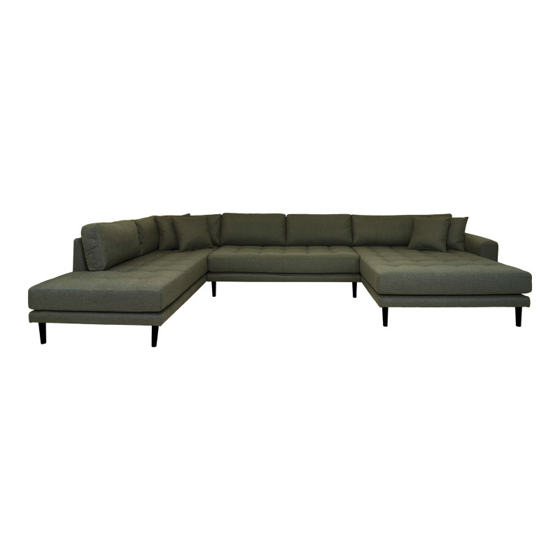 Grand format convivial. Ce canapé panoramique en tissu vert olive combine une récamière à gauche et une mérideinne à droite. Il est parfait pour accueillir toute la famille. Sa couleur riche crée une ambiance chaleureuse. L'alliance parfaite de la matière et de la ligne pour un espace de vie XXL. Coussins déco inclus.