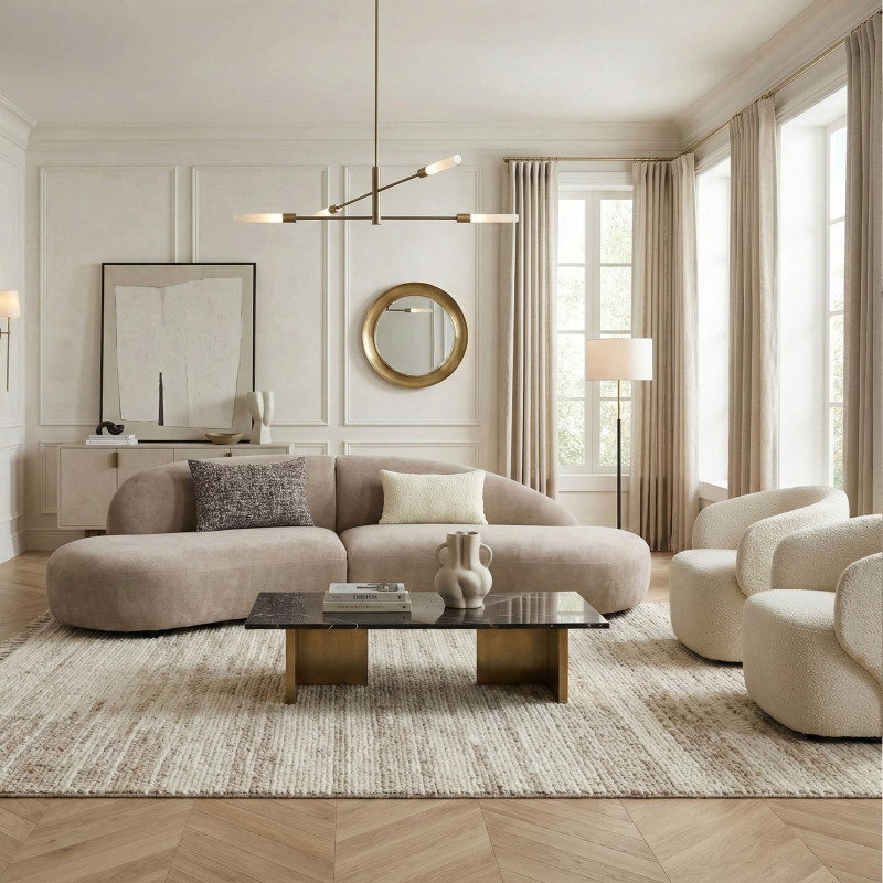 Design contemporain, format XXL ! Ce canapé d'angle en tissu taupe se distingue par sa forme asymétrique, créant un espace de détente original. Son design bas et enveloppant invite au repos. L'alliance parfaite de la matière et de la ligne pour un salon moderne. Confort enveloppant garanti.