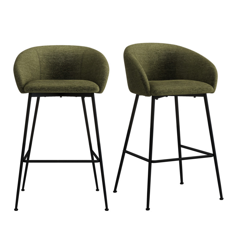 Il dispose d'une assise et d'un dossier rembourrés pour assurer un maximum de confort. La structure est en métal noir et offre une hauteur d'assise de 65 cm, adaptée aux îlots de cuisine.