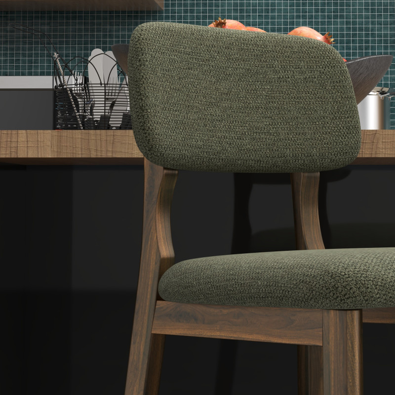 Version présentée en bois patiné noyer et tissu Trendy Sauge.