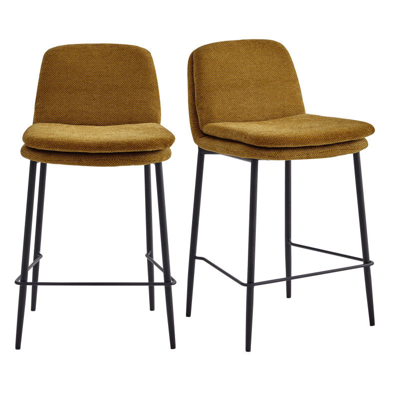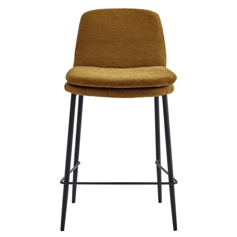On aime tout particulièrement son piètement en métal noir de 16 mm avec des pieds fuselés, le travail de couture avec son double coussinage rembourré sur l'assise et le dossier et revêtu du tissu Luxury Moutarde labellisé Oeko-Tex.