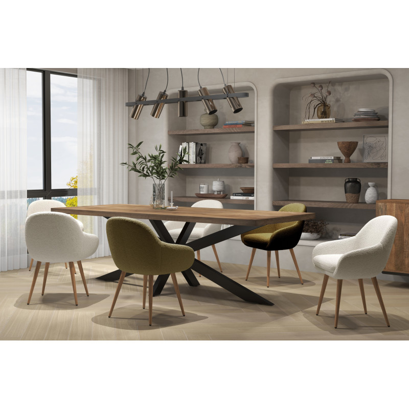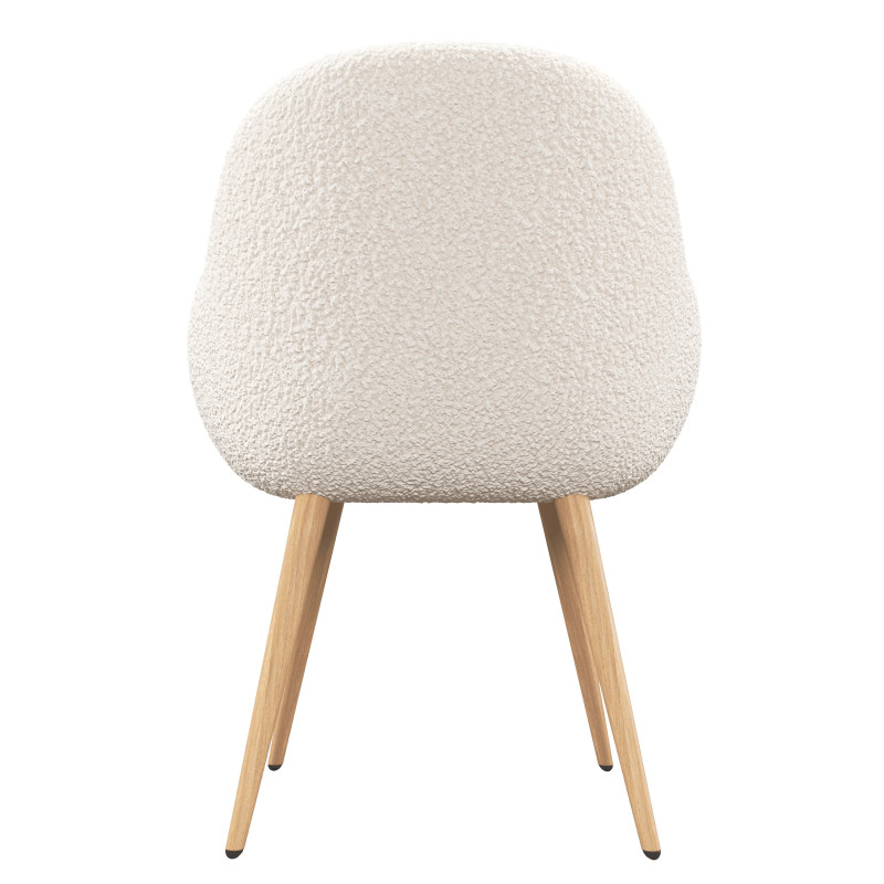 La chaise design et confortable comme un fauteuil. Bien stable sur ses 4 pieds en métal décor bois surmontés d'une large assise comprenant un coussin rembourré de mousse polyuréthane cette chaise est taillée pour le confort. L'assise et le dossier sont d'une forme particulièrement agréable tel un fauteuil et qui assure un bon maintien. Finition tissu bouclé écru, elle est aussi déclinée en plusieurs coloris vous pourrez l'associer facilement à un large choix de table et dans tout type d'intérieur.