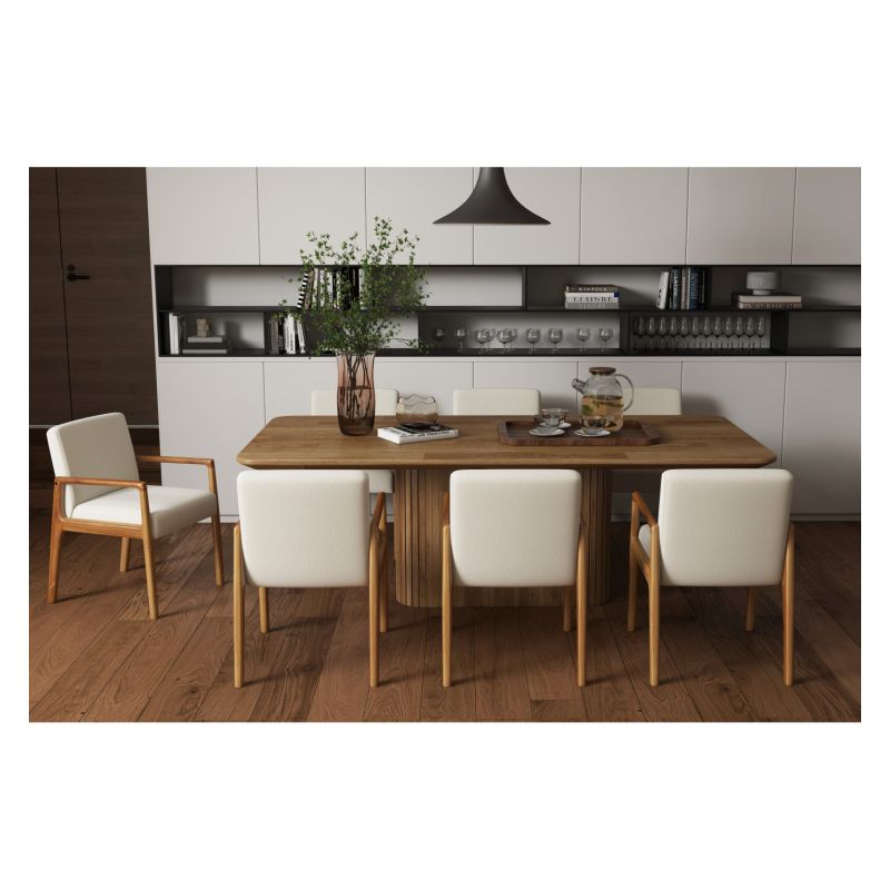 Le fauteuil de table ALBAN propose une ligne résolument contemporaine à la fois chic et élégante, grâce à la belle patine du bois massif et à son revêtement très tendance.