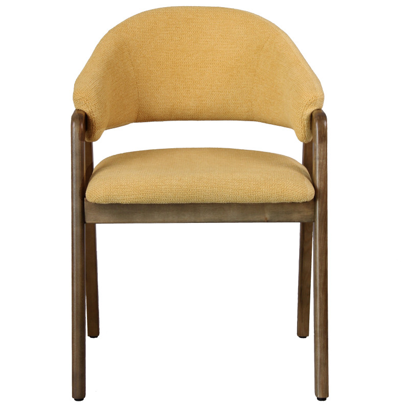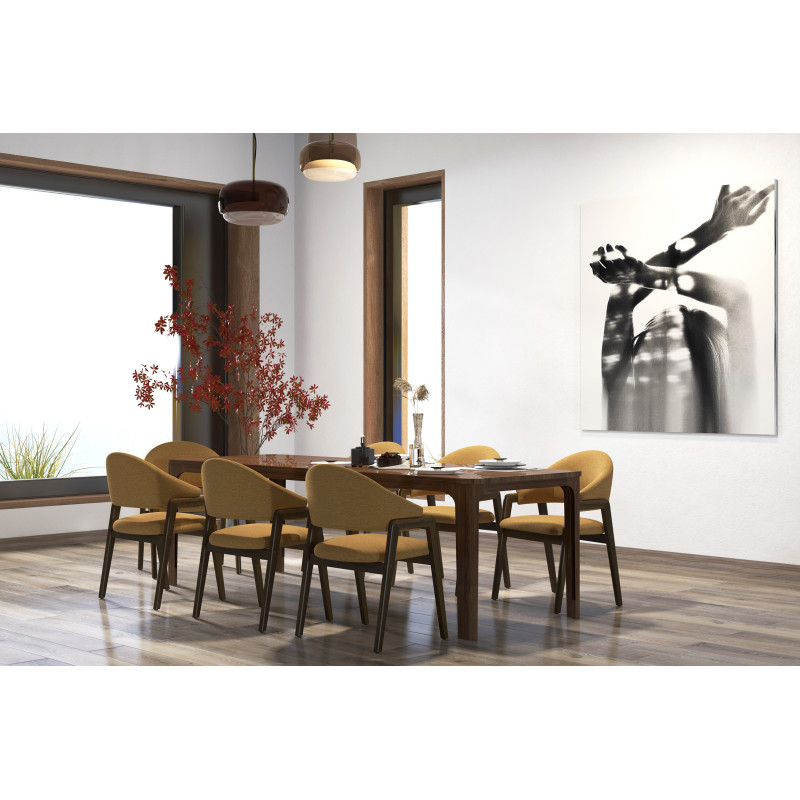 Version présentée en Frêne patiné noyer et tissu Trendy Safran.
