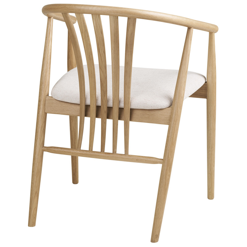 Chaleur et douceur. Ce fauteuil de table en tissu beige est conçu avec une structure en chêne massif. Il allie le confort d'un fauteuil et la fonctionnalité d'une chaise de table. L'alliance parfaite de la matière et de la ligne pour un intérieur raffiné.