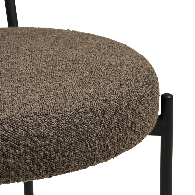 Chaleur texturée. Cette chaise en tissu bouclette marron allie une texture riche à un design minimaliste. Le piètement en métal noir renforce le style. L'alliance parfaite de la matière et de la ligne pour un intérieur sophistiqué.