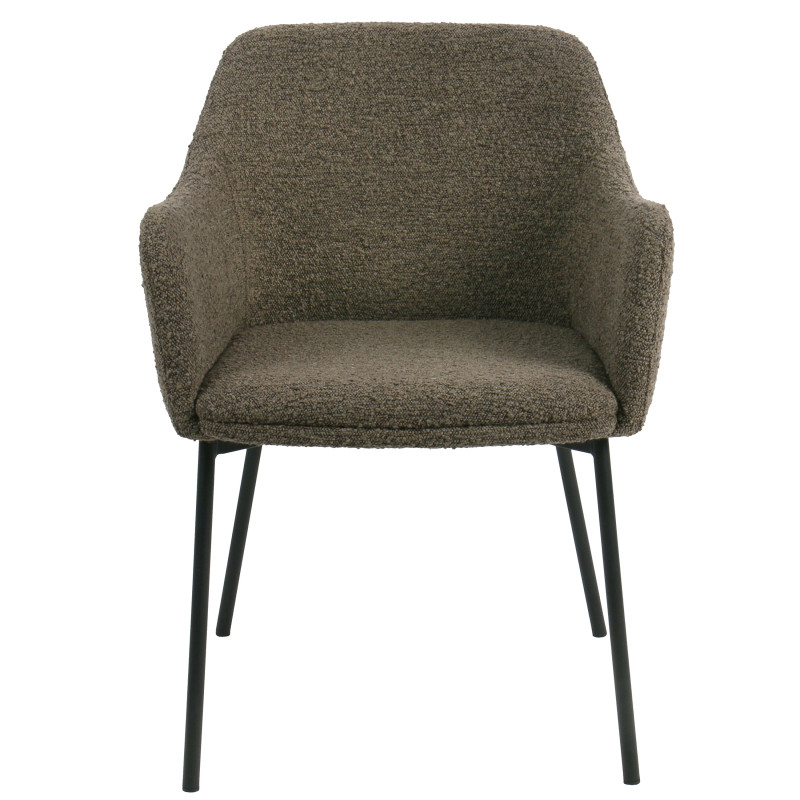 Confort et tendance. Ce fauteuil de table en tissu bouclette taupe est idéal pour un repas prolongé. Sa couleur neutre s'intègre facilement. L'alliance parfaite de la matière et de la ligne pour un espace accueillant.