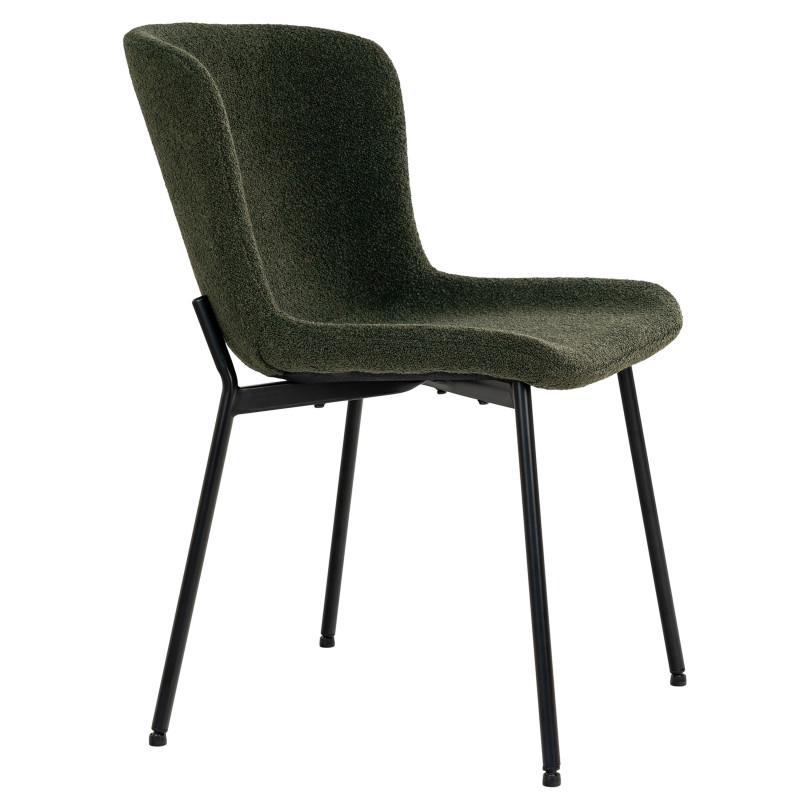 Collection MINA : Chaise Tissu Vert Note de fraîcheur. Cette chaise en tissu vert injecte une couleur vive et tendance à votre salle à manger. Le piètement en métal noir renforce le style contemporain. L'alliance parfaite de la matière et de la ligne pour un espace dynamique. Dimensions : L. 59 x l. 48 x H. 83 cm