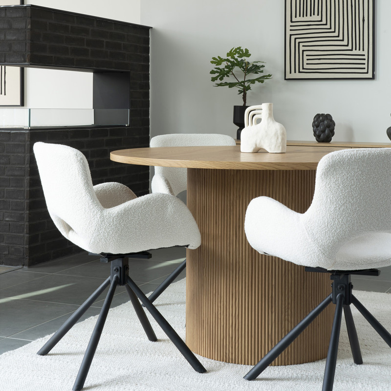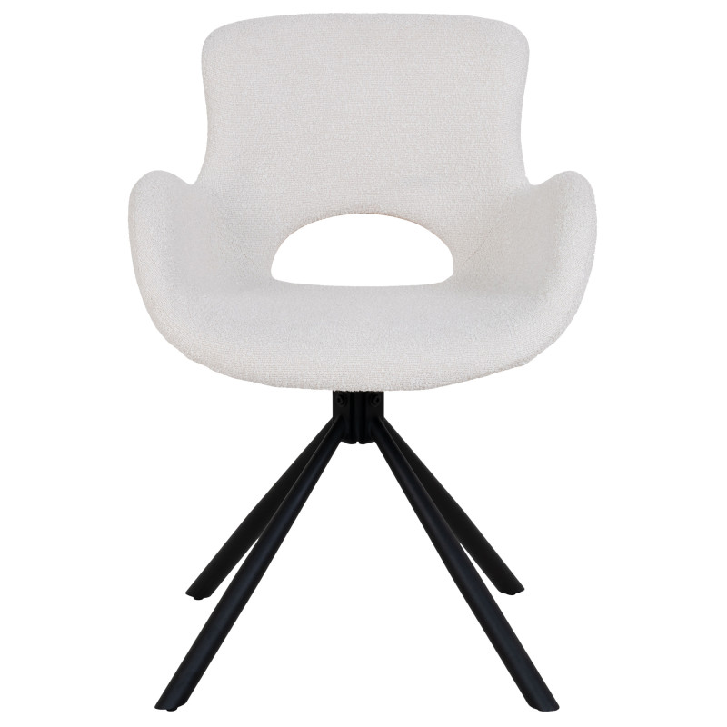 Collection SIXTY : Chaise Pivotante Tissu Bouclé Tendance et confort. Cette chaise pivotante en tissu bouclé écru apporte une douceur moderne à votre table. La rotation à 360° ajoute une fonctionnalité bienvenue. L'alliance parfaite de la matière et de la ligne pour un repas flexible. Dimensions : L. 58 x l. 59 x H. 82,5 cm