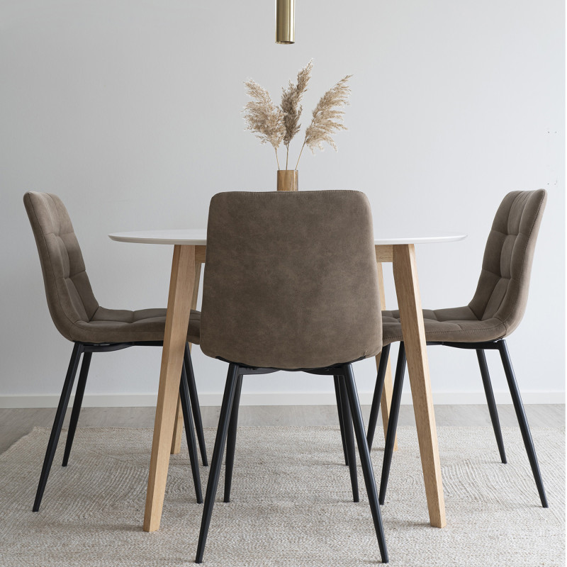 Collection SVIN : Chaise Vintage marron Rétro industriel. Cette chaise en microfibre marron vintage apporte un charme rétro à votre table. Le piètement en métal noir crée un contraste parfait. L'alliance parfaite de la matière et de la ligne pour un repas avec du cachet. Dimensions : L. 55 x l. 44 x H. 86 cm
