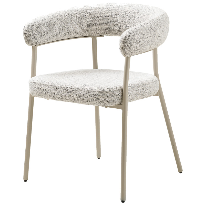 Douceur et lumière. Ce fauteuil de table en tissu sable est idéal pour apporter de la clarté. Le piètement en métal beige crée une harmonie subtile. L'alliance parfaite de la matière et de la ligne pour un intérieur frais.
