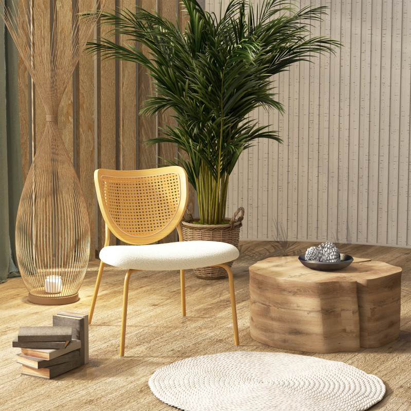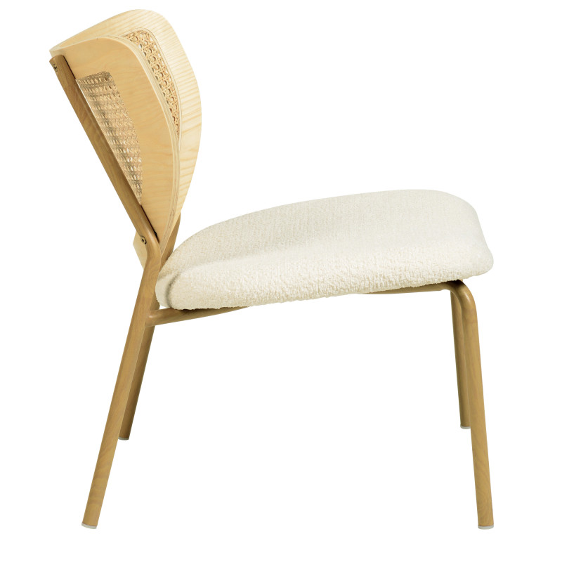 Un mix réussi de matières avec sa structure en métal décor chêne, son assise rembourrée revêtue d'un tissu bouclé Ecru et son dossier galbé en bois massif et rotin naturel.