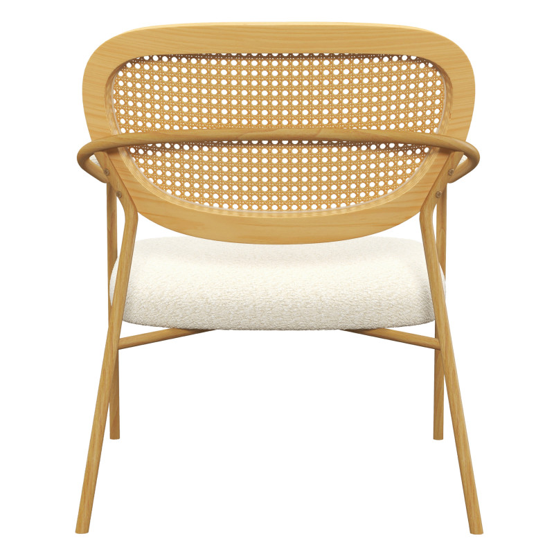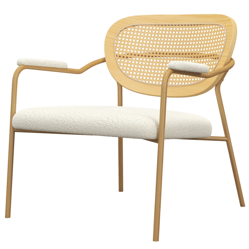 Un mix réussi de matières avec sa structure en métal décor chêne, son assise rembourrée revêtue d'un tissu bouclé Ecru et son dossier galbé en bois massif et rotin naturel.