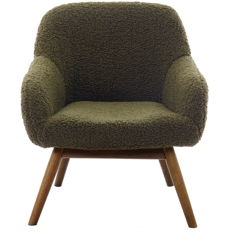 Version présentée en tissu bouclé Army et bois patiné noyer.
