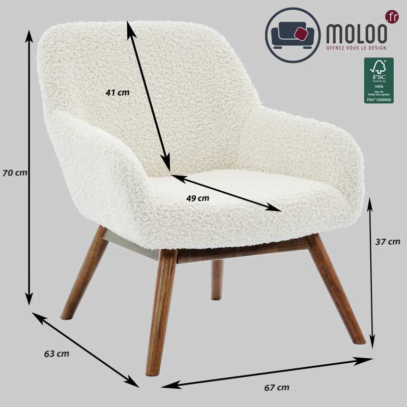 Version présentée en tissu bouclé écru et bois patiné noyer.