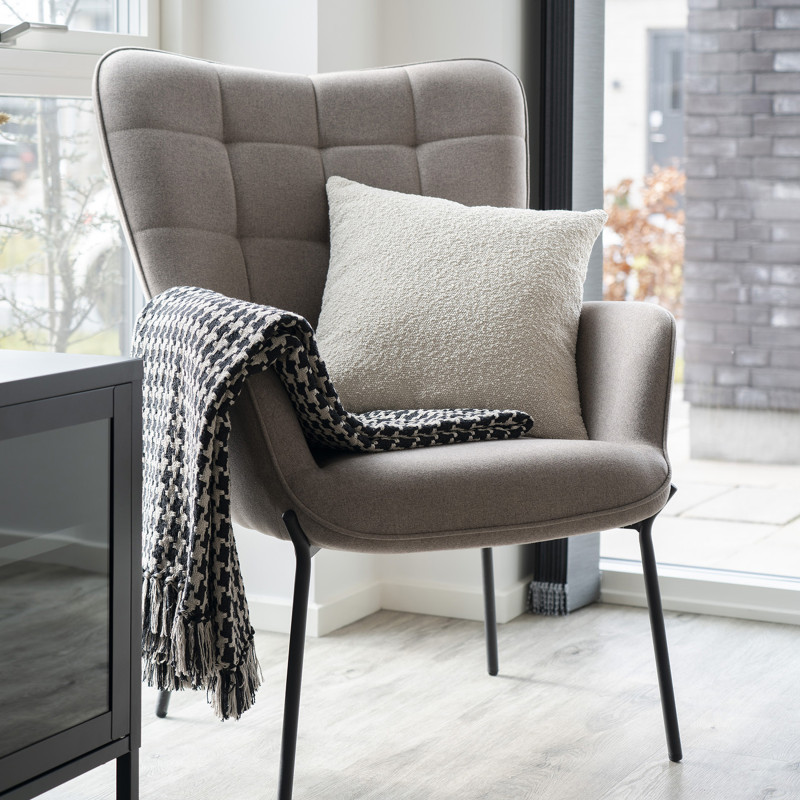 Caractère et douceur. Ce fauteuil en tissu bouclette taupe est une pièce de design qui invite à la détente. Son look vintage est soutenu par un piètement en métal discret. L'alliance parfaite de la matière et de la ligne pour un intérieur sophistiqué. Confort enveloppant garanti.