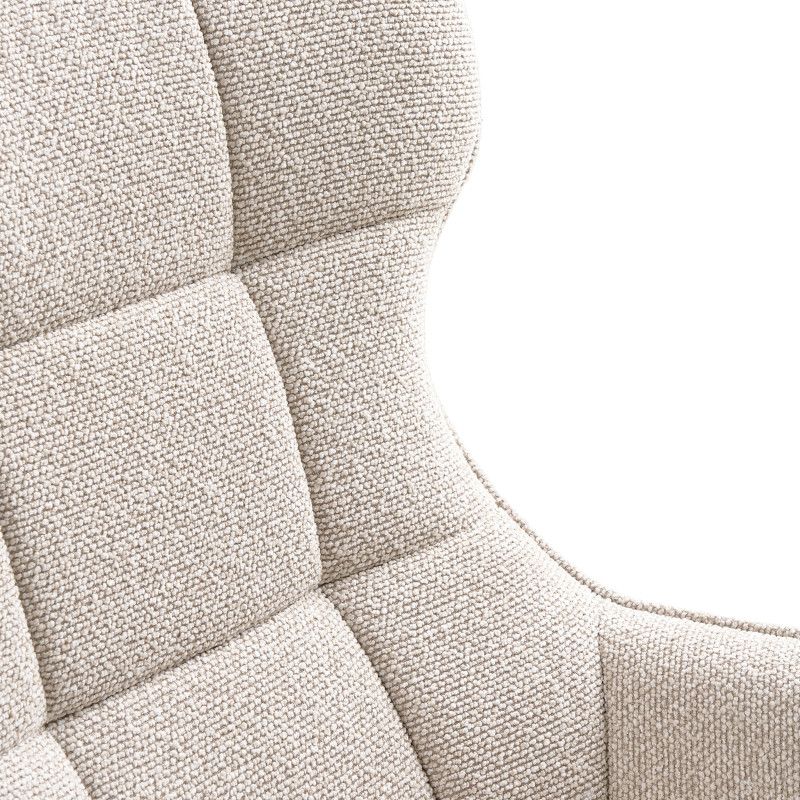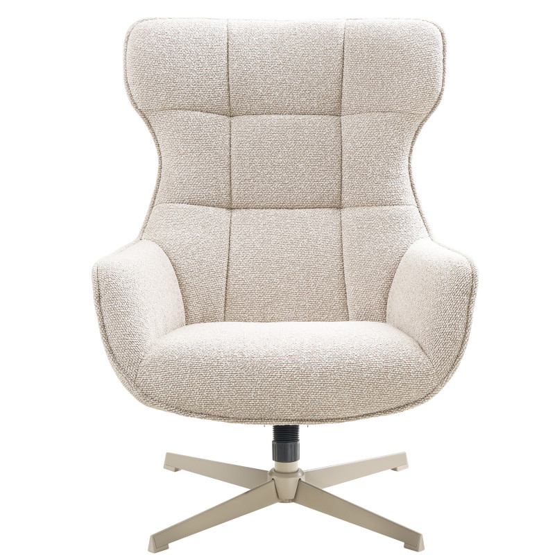 Confort enveloppant. Cette chaise lounge en tissu beige est une invitation à la détente. Le piètement fin en métal assure une stabilité élégante avec une fonction pivotante. L'alliance parfaite de la matière et de la ligne pour un coin cosy.
