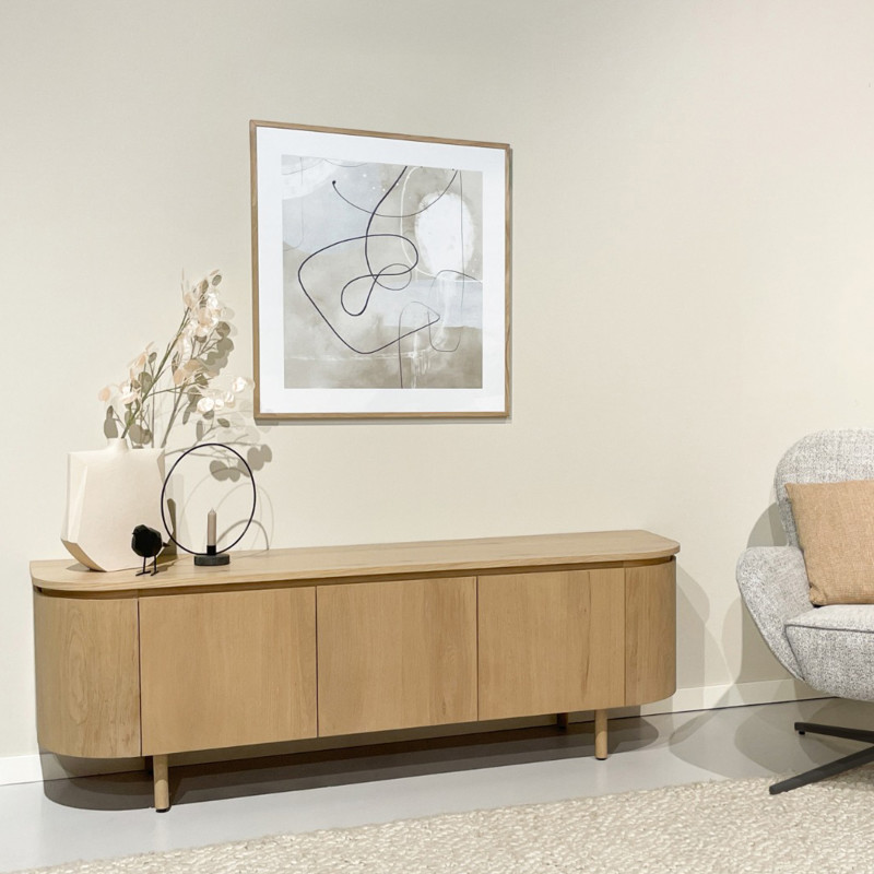 Banc TV présenté largeur 170 cm et finition chêne naturel.