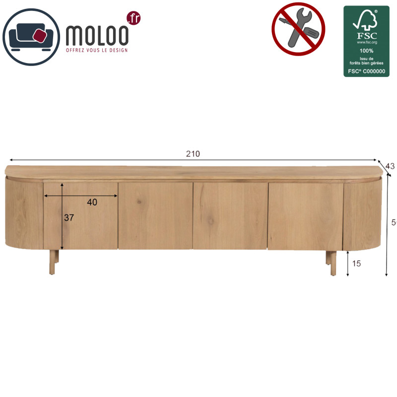 Meuble TV présenté en 210 cm et chêne.