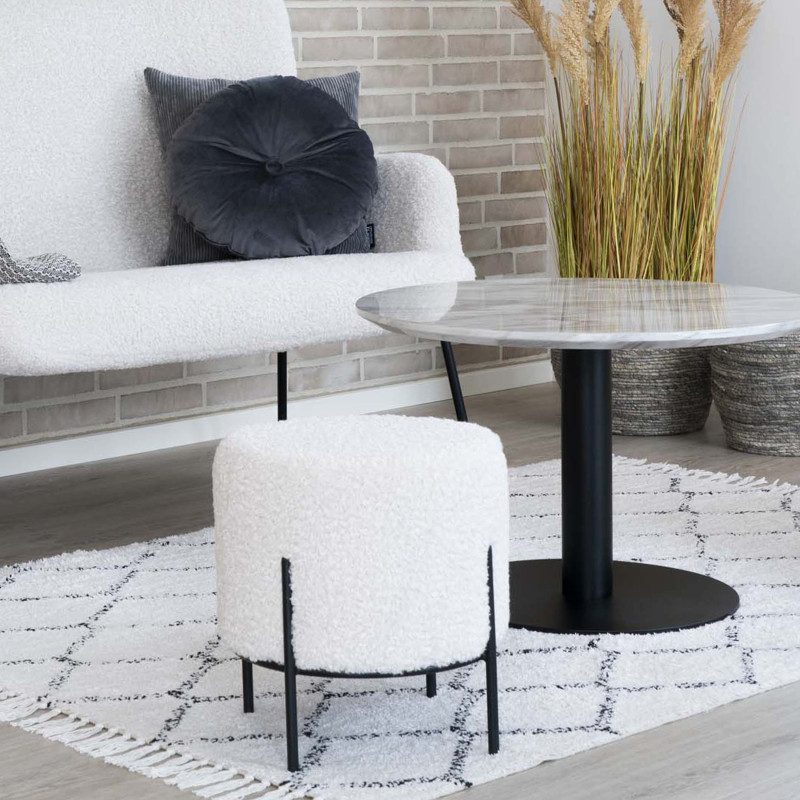 Collection TED : Pouf Tissu Bouclé Maxi-douceur. Ce pouf rond en tissu bouclé écru est une assise d'appoint généreuse. La structure en méatl apporte une note très chic. L'alliance parfaite de la matière et de la ligne pour un intérieur cosy. Dimensions : L. 35 x l.35 x H. 37 cm