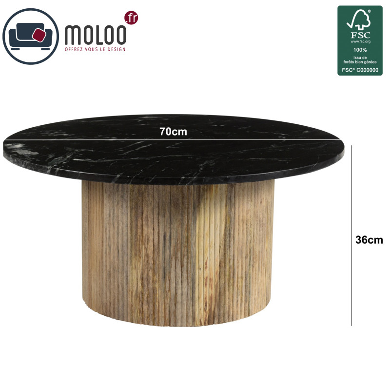 Elle dispose d'un plateau en diamètre 70 cm en marbre noir (épaisseur 2cm). Le piètement est en lattes de manguier massif vernis.