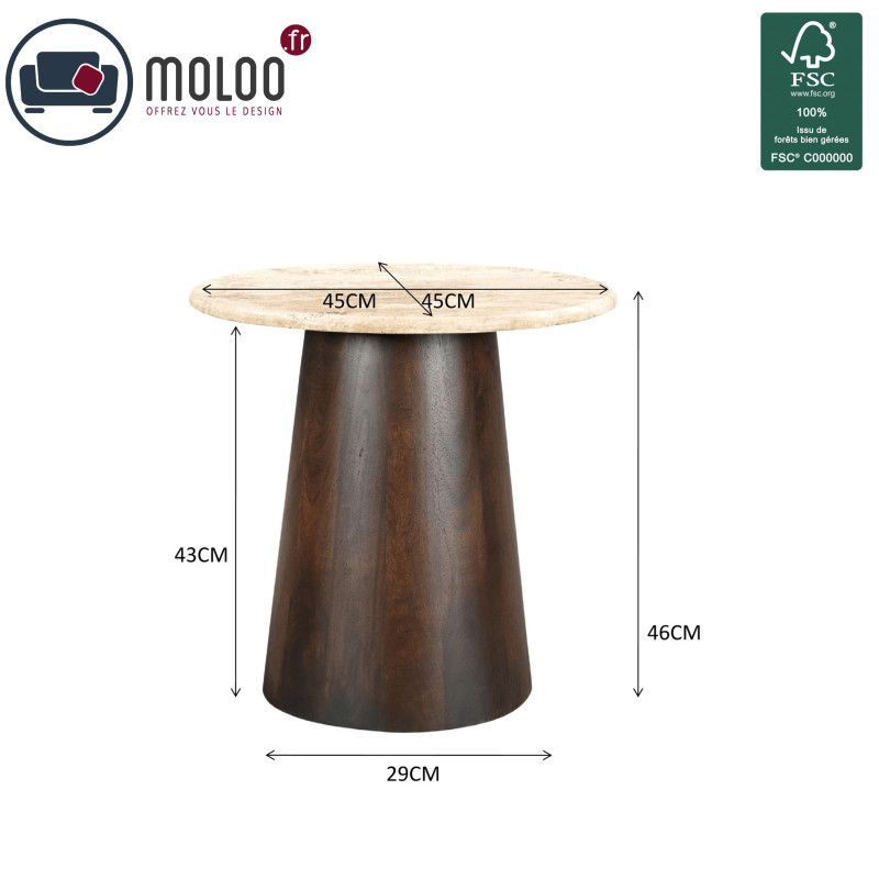 La table basse ronde présentée dispose d'un plateau en diamètre 44 cm.