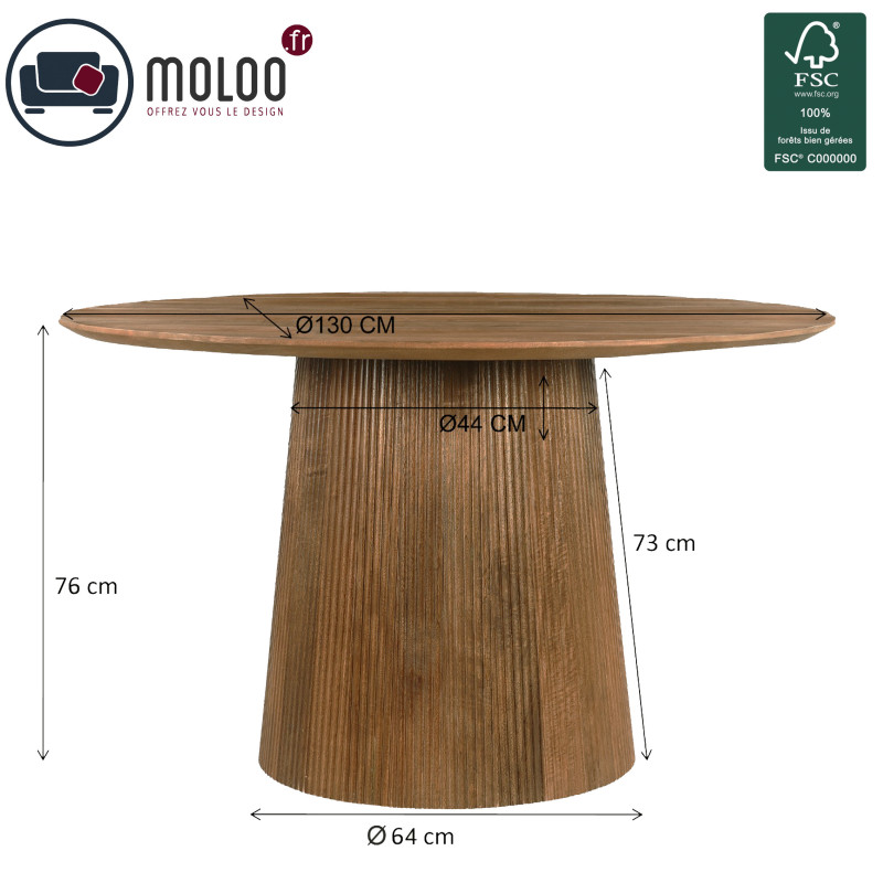 la table repas ronde 4 convives présentée est en diamètre 130 cm, finition naturelle.