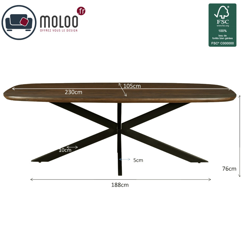 La table présentée est en 230 x 105 cm avec plateau ovale teinté noyer.
